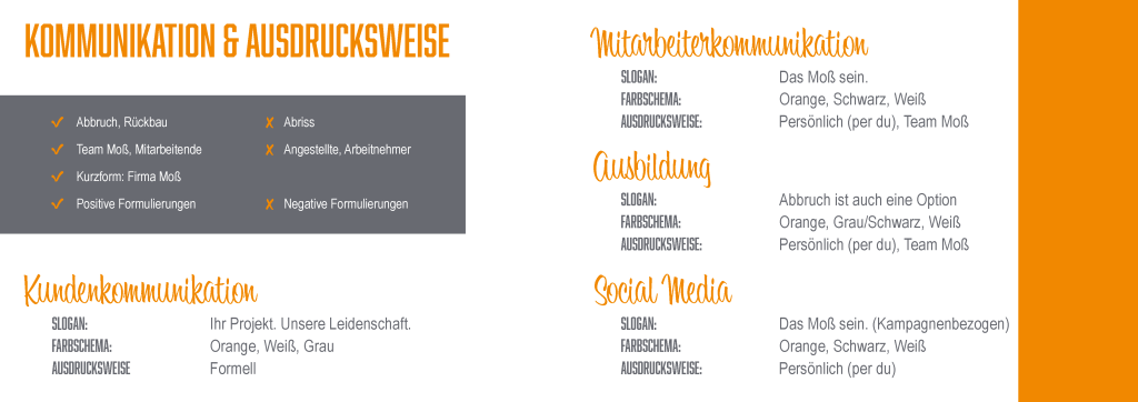 Der Guide regelt nicht nur Gestaltungselemente, sondern auch die Ausdrucksweise gegenüber verschiedenen Zielgruppen (Kund*innen, Mitarbeitende, Öffentlichkeit, Social Media). So wird Corporate Design nicht als rein visuelles Element verstanden, sondern als strategisches Kommunikationsinstrument.