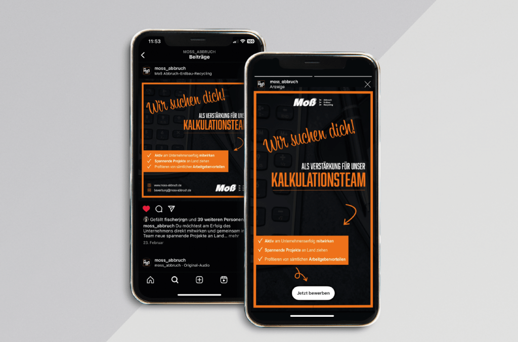 „Das Moß sein.“ ist eine Employer-Branding-Kampagne, die die Unternehmenskultur von Moß Abbruch bewusst nicht erklärt, sondern erlebbar macht. Im Mittelpunkt steht die Haltung: Gute Arbeitsbedingungen, Teamgeist, spannende Projekte und Wertschätzung sind bei Moß kein Benefit, sondern selbstverständlich. Der Launch über ein Musikvideo bricht mit klassischen Branchenbildern und transportiert Emotion, Stolz und Zugehörigkeit auf eine moderne, selbstbewusste Art.